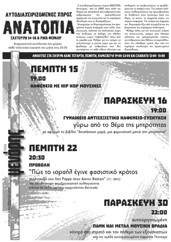 πρόγραμμα εκδηλώσεων Γενάρη στον αυτοδιαχειριζόμενο χώρο ΑΝΑΤόΠΙΑ