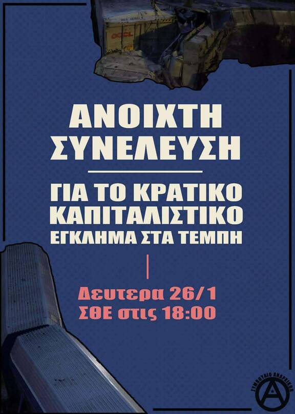Γι' αυτό καλούμε σε ανοιχτή συνέλευση ενάντια στο έγκλημα των Τεμπών και στο σύστημα που το γέννησε και το έθρεψε. Για να συζητήσουμε, να αναλύσουμε, να συνδέσουμε τους αγώνες μας και να οργανώσουμε συλλογικές απαντήσεις. Για να μετατρέψουμε την οργή σε συνειδητή δύναμη αντίστασης. Για να υπερασπιστούμε τη ζωή απέναντι στο κράτος, το κεφάλαιο και τον πόλεμο.