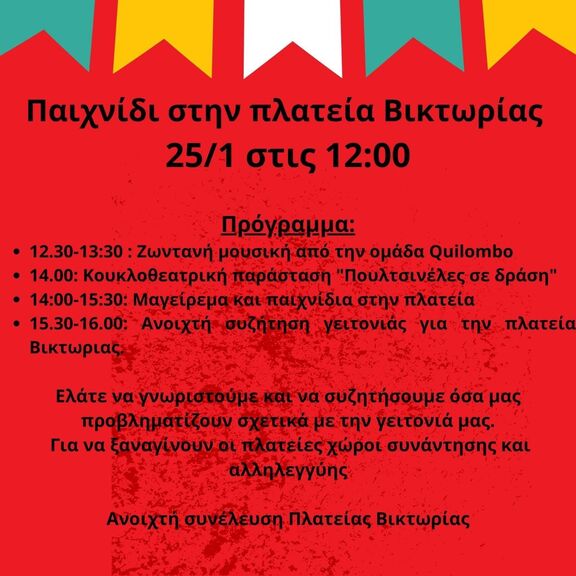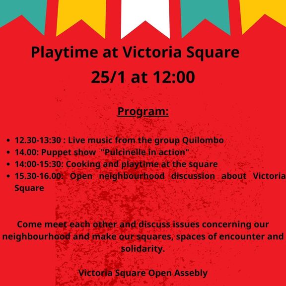 15.30-16.00 ανοιχτή συζήτηση γειτονιάς για την πλατεία Βικτωριας.