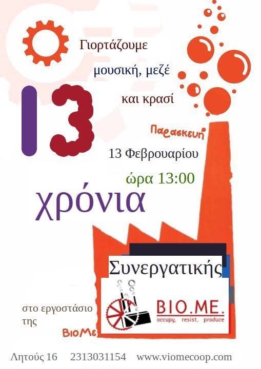 Σας καλούμε να γιορτάσουμε αυτά τα 13 χρόνια κόπων, προσπαθειών και αγώνων από τους εργαζόμενους και τους αλληλέγγυους να στηριχτεί το εγχείρημα της Συνεργατική ΒΙΟΜΕ. Ένα εγχείρημα που είναι πιο επίκαιρο παρά ποτέ για την αυτοδιαχείριση της παραγωγής.