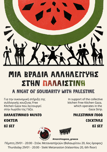 Gaza still lives under attack, under siege, under genocide. Palestinians continue to be killed from bullets and bombs, sleep in the ruins, die of the cold, struggle for their survival day by day, hour by hour. We stood and we will continue to stand by them. In Thursday 29/1 we are organising a night of solidarity with Palestine. With music, coctails and Palestinian food to support the Free Kitchen Gaza, a collective kitchen operating in the Gaza strip - and at the same time, openly declare that we are not forgetting and we will never forget Palestine.