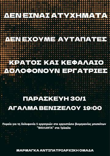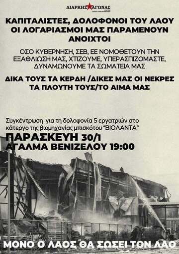Τα χαράματα της Δευτέρας 26/01 συνέβη έκρηξη και φωτιά στο εργοστάσιο βιομηχανίας "Βιολάντα" με 5 νεκρές εργάτριες και οκτώ τραυματίες. Αυτή η δολοφονική ενέργεια δε μπορεί παρά να μας προκαλέσει οργή. Εκατοντάδες εργατικές δολοφονίες κι ατυχήματα συμβαίνουν στην Ελλάδα ετησίως, εκ των οποίων πολλά μένουν στην αφάνεια ή αποσιωπούνται καθώς στο ανθρωποφαγικο σύστημα του καπιταλισμού η εργασιακή εξαθλίωση είναι μια κανονικότητα. Εργοδοτικές αυθαιρεσίες, ελλειπή ή καθόλου μέτρα προστασίας, μόνιμη ανασφάλεια, για να έχουν τα αφεντικά όσο περισσότερα κέρδη μπορούν, φυσικά στις δίκες μας πλάτες. Την ίδια στιγμή η κυβέρνηση ψηφίζει αντεργατικά νομοσχέδια (13ωρη εργασια) και εντείνει τη καταστολή ποινικοποιώντας τις απεργίες εργαζομένων.