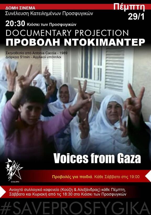 Την Πέμπτη 29/1 στις 20:30 στο Κιόσκι των Προσφυγικών (Λ. Αλεξάνδρας & Κούζη) θα προβληθεί το ντοκιμαντέρ "Voices from Gaza", σκηνοθετημένο απο την Antonia Caccia το 1989. Το ντοκιμαντέρ έχει διάρκεια 51 λεπτά, είναι στα αγγλικά και έχει αγγλικούς υπότιτλους.