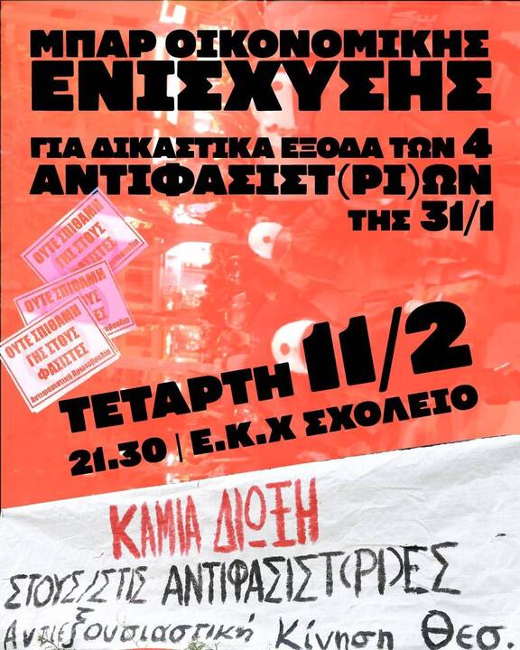 Μπαρ οικονομικής ενίσχυσης για τα δικαστικά έξοδα των 4 Αντιφασιστ(ρι)ών της 31/1/2026.