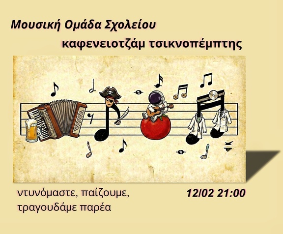 Η Μουσική Ομάδα Σχολείου θα είναι εκεί, αλλά φυσικά όπως πάντα, φέρτε τα όργανα σας, όσο και αν παίζετε, γιατί η συμμετοχή ειναι πραγματικά σημαντική για όλα μας!