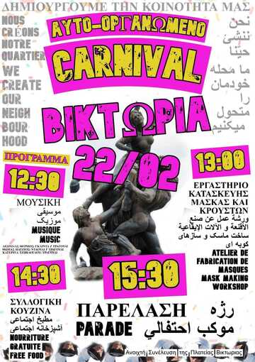 Σε μία εργατική και μεταναστευτική γειτονιά, όπου ρατσιστικές, σεξιστικές και ταξικές καταπιέσεις προσπαθούν να μας κάνουν αόρατοι-ες-α και διαχωρισμένες, παίρνουμε το καρναβάλι σαν ευκαιρία να μαζευτούμε και να ενδυναμώσουμε τους δεσμούς μας. Το κράτος προσπαθεί να υποβάλει στους δρόμους μας μια πραγματικότητα από φόβο, με ρατσιστικές επιχειρήσεις 'σκούπα', έλεγχο χαρτιών και αστυνομοκρατία. Πολλές/ά/οί από εμάς συνεχώς αντιμετωπίζουμε την απειλή για φυλάκιση η ακόμα και επαναπροώθηση. Θέλουμε κοινότητες αγώνα και αλληλεγγύης να ξεπεράσουμε συλλογικά όλα όσα μας καταπιέζουν. Θέλουμε η γειτονιά μας να είναι ένας χώρος ζωής, συνάντησης και συνύπαρξης.