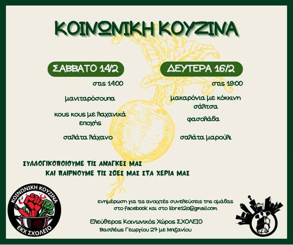 Ο μόνος τρόπος για να μπορέσουμε να σπάσουμε την καθημερινή βιαιότητα του συστήματος, είναι να δείξουμε την ανθρωπιά και την αλληλεγγύη μας. Έτσι, σαν Ελεύθερος Κοινωνικός Χώρος Σχολείο πήραμε την πρωτοβουλία να δημιουργήσουμε μία Κοινωνική Κουζίνα. Αυτή θα είναι η δομή που θα παρέχει ελεύθερη πρόσβαση σε ποιοτική τροφή και παράλληλα θα ενεργοποιεί τα αντανακλαστικά ισότητας και αλληλοβοήθειας που έχουμε ως κοινωνία. Ως καταπιεσμένοι/ες στόχος μας δεν είναι η "φιλανθρωπία", δηλαδή από τον ισχυρό στον αδύναμο, αλλά ισότιμη αλληλεγγύη μας.