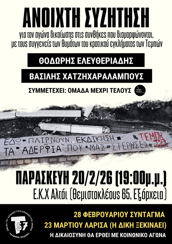 Η Δίκη πλησιάζει. Ο Αγώνας για δικαίωση βρίσκεται σε κρίσιμο σταυροδρόμι. Τρία χρόνια τώρα οι συγγενείς των θυμάτων προσπαθούν να διαχειριστούν τις συνέπειες τόσο τις προσωπικές όσο και τις δημόσιες. Η κοινωνία μέχρι τώρα έχει ανταποκριθεί και έχει δημιουργηθεί ένα κίνημα αλληλεγγύης και αντίστασης στις προσπάθειες του κράτους για πολιτική και νομική συγκάλυψη. Τώρα είναι η στιγμή που πρέπει να φανούμε χρήσιμοι όσο ποτέ συμμετέχοντας με μεγαλύτερο πάθος σε όλα τα καλέσματα. Με αυτό τον τρόπο μπορεί μόνο να διατηρηθεί η αξιοπρέπεια και η αγνότητα του κινήματος των Τεμπών ενάντια σε κάθε προσπάθεια καπήλευσης αλλά και παραγωγής ιδιωτικής ή κομματικής υπεραξίας. Είναι ένα κίνημα από τα κάτω. Ας διατηρήσουμε λοιπόν την αρχική του αθωότητα. Μόνο όλοι μαζί μπορούμε να το πετύχουμε αυτό.