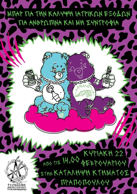 Την Κυριακή 22 Φεβρουαρίου θα πραγματοποιηθεί μπαρ για την οικονομική ενίσχυση ανθρώπινων και μη συντροφιών για ιατρικά έξοδα, στην κατάληψη κτήματος Πραποπούλου. Θα έχουμε μπιράκια, ποτάκια αλλά και μη αλκοολούχα ποτά. Το μπαρ θα ξεκινήσει από τις 14.00 μέχρι νωρίς το βραδάκι. Ελάτε να πιούμε τα ροφήματα μας και να κουβεντιάσουμε.