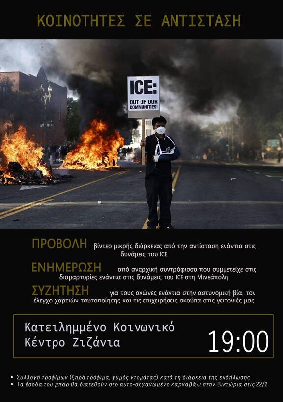 Στην Ελλάδα οι αντιστάσεις στις αντιμεταναστευτικές πολιτικές ποικίλουν ανά τα χρόνια, από στεγαστικές καταλήψεις μεταναστών (Όπως η Νοταρά και το παλιό City plaza) μέχρι διαφορετικού τύπου διαδηλώσεις, συνελεύσεις και δημιουργία αλληλέγγυου κινήματος στα νησιά ως σημεία προσέλευσης στην Ευρώπη. Το ότι δεν υπάρχει ο ICE εδώ δεν σημαίνει πως βρισκόμαστε σε καλύτερη κατάσταση. Θέλουμε να ενισχύσουμε τους δεσμούς μέσα στις κοινότητές μας, πολεμώντας τον φυλετικό διαχωρισμό που εφαρμόζει το κράτος.