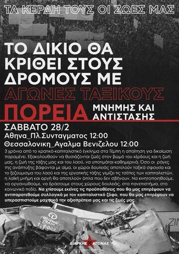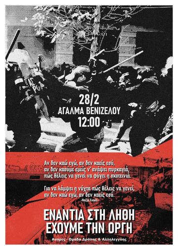 Εμείς από τη δικιά μας πλευρά αντιλαμβανόμαστε την 28 Φεβρουαρίου ως μέρα άμεσα συνδεδεμένη με τον συνολικότερο αγώνα μας με όλα τα μέσα για την ολική καταστροφή κάθε εξουσίας. Διότι δεν αντιλαμβανόμαστε το γεγονός αυτό ως "ατύχημα", αλλά ως τρανταχτό παράδειγμα υποτίμησης ανθρώπινων ζωών μπροστά στο κέρδος της άρχουσας τάξης. Γνωρίζοντας πως η αστική δικαιοσύνη υφίσταται για να προστατεύει τους καταπιεστές και να στρέφει τα βέλη της στις καταπιεσμένες που αντιστέκονται, αναγνωρίζουμε πως το δίκιο το έχουν τα εξεγερμένα, και απαντάμε στη βία του κράτους επιστρέφοντάς του μέρος αυτής της βίας που δεχόμαστε καθημερινά από αυτό. Διότι βία της εξουσίας είναι και η φτώχεια, η μισθωτή σκλαβιά, οι νόμοι, τα σύνορα, η πατριαρχία, ο εγκλεισμός, όπως και η ίδια η ύπαρξη της εξουσίας. Επομένως, η επιθετική αλληλεγγύη είναι και θα είναι πάντα αναπόσπαστο κομμάτι των αγώνων μας και δεν σταματάμε να την υπερασπιζόμαστε. Οι δυνάμεις της κυριαρχίας συναντιούνται ενστικτωδώς όταν θρηνούμε δεκάδες ή εκατοντάδες νεκρών. Εμείς επιλέγουμε να συναντηθούμε μέσα αλλά και πέρα από το πένθος, συνδέοντας την θλίψη και οργή μας σε αγώνες μέσω των οποίων θα θέσουμε εμείς τους όρους με τους οποίους θα ζήσουμε.