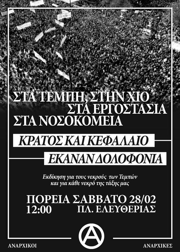 Φέτος συμπληρώνονται 3 χρόνια από το κρατικό - καπιταλιστικό έγκλημα στα Τέμπη. 3 χρόνια και τίποτα δεν έχει τελειώσει. Συγκάλυψη, παραπλάνηση και έλεγχος της δικαιοσύνης, ψευδή στοιχεία, δολοφονίες μαρτύρων, κοροϊδία και διαπόμπευση συγγενών και αγωνιστ(ρι)ών αλληλέγγυων. 3 χρόνια που οι ένοχοι μας κουνάνε το δάχτυλο και είναι ακόμα ατιμώρητοι, ενώ κράτος και κεφάλαιο αδιάλειπτα σκοτώνουν και τρομοκρατούν. Από τα σύνορα και την ολομέτωπη επίθεση στις μετανάστ(ρι)ες, μέχρι τα εργοστάσια κάτεργα, τα τρένα, τα νοσοκομεία, τα πλοία και τις φυλακές, η ανάπτυξη και τα κέρδη τους βάφονται από το αίμα της τάξης μας. Όλα αυτά σε μια συνθήκη συνεχούς στρατιωτικοποίησης της κοινωνίας, όπου η πολεμική μηχανή ακονίζει τα μαχαίρια της έτοιμη να μας θυσιάσει σε διακριτικούς, εθνικιστικούς και ιμπεριαλιστικούς πολέμους. Η θέση μας, λοιπόν, δεν μπορεί να είναι άλλη από το δρόμο. Η δικαιοσύνη για τους νεκρούς της τάξης μας δεν αποδίδεται στα έδρανα της Βουλής, στις εκλογές. Η δικαιοσύνη που απαιτούμε δεν μπορεί να είναι η ίδια που διαιωνίζει το κρατικό μονοπώλιο εξουσίας και τη κυριαρχια πάνω στα σώματα μας. Η δικαιοσύνη αποδίδεται στο δρόμο, στον διαρκή αγώνα για την κοινωνική απελευθέρωση και την ταξική χειραφέτηση.