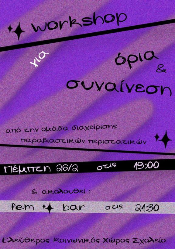 Αυτό το workshop της Ομάδας Διαχείρισης Παραβιαστικών Περιστατικών της Πολιτικής Συνέλευσης του Ε.Κ.Χ. Σχολείο είναι μια προσπάθεια να δομήσουμε δίκτυα επικοινωνίας, ισότητας και ασφάλειας. Να μη δίνουμε πια χώρο σε κανένα πατριαρχικό κατάλοιπο. Να ενδυναμωθούμε και να απαντάμε συλλογικά απέναντι στην έμφυλη βία, μέχρι ο φόβος να μην έχει θέση ανάμεσά μας. Μέχρι η ελεύθερη και ασφαλής έκφρασή μας, να μη χρειάζεται δεύτερες σκέψεις.»