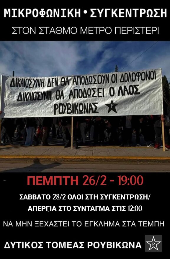 Την Πέμπτη 26/2 στις 19:00 στο Περιστέρι, ο Δυτικός Τομέας Ρουβίκωνα πραγματοποιεί μικροφωνική συγκέντρωση, για να μη ξεχαστεί το έγκλημα, για να ακουστούν οι φωνές των νεκρών και των οικογενειών τους. Γιατί τα Τέμπη δεν ήταν ατύχημα, ήταν δολοφονία.