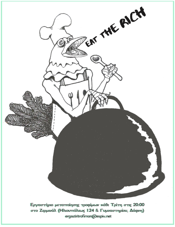 Αυτή τη Δευτέρα στις 18:00, ανοίγουμε το εργαστήριο μεταποίησης τροφίμων. Το εργαστήριο μεταποίησης τροφίμων φιλοδοξεί να ασχοληθεί με θέματα που σχετίζονται με την παραγωγή και μεταποίηση της τροφής, με την συλλογική κάλυψη υλικών αναγκών και επιθυμιών, με ζητήματα συνεργατικής, κοινοτικής παραγωγής και οικονομίας.