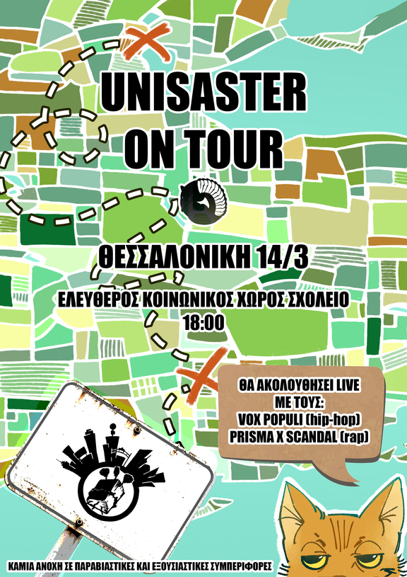 UNISASTER ON TOUR λοιπόν με δεύτερη στάση για τώρα τον Ελεύθερο Κοινωνικό Χώρο Σχολείο στη Θεσσαλονίκη, στις 14/3 18:00. Μετά την παρουσίαση του εγχειρήματος και συζήτηση θα ακολουθήσει live με τους VoxPopuli (hip hop), Prisma (rap), Scandal (rap) για την οικονομική ενίσχυση της Δομής Βιβλιοπωλείου/Βιβλιοθήκης.