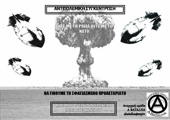 Από μέρους μας λοιπόν ως αναρχικοί και αναρχικές, ως προλετάριοι και προλετάριες, ως καταπιεσμένοι και καταπιεσμένες η στάση μας είναι και ήταν διαχρονικά ενάντια στον πόλεμο και τον μιλιταρισμό. Γιατί καταλαβαίνουμε ότι κανένας πόλεμος της εξουσίας δεν έγινε για τα συμφέροντά μας. Γιατί στον βάλτο που μαλώνουν τα βουβάλια την πληρώνουν τα βατράχια. Η θέση μας λοιπόν οφείλει να είναι στο πλευρό όλων των προλεταρίων που σφαγιάζονται καθημερινά εξαιτίας των διακρατικών ανταγωνισμών.