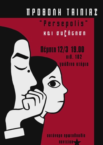 Την Πεμπτη 12/3 στις 19:00 στην αίθουσα 102 στο ισόγειο του γυάλινου στο Πάντειο προβάλλουμε την ταινία " Persepolis". Μετά την ταινία θα ακολουθήσει συζήτηση για τον πόλεμο, την δυτική ματιά και την εργαλειοποίηση του φεμινισμού για το ξέπλυμα του και μετά μπαρ οικονομικής ενίσχυσης του σχήματος
