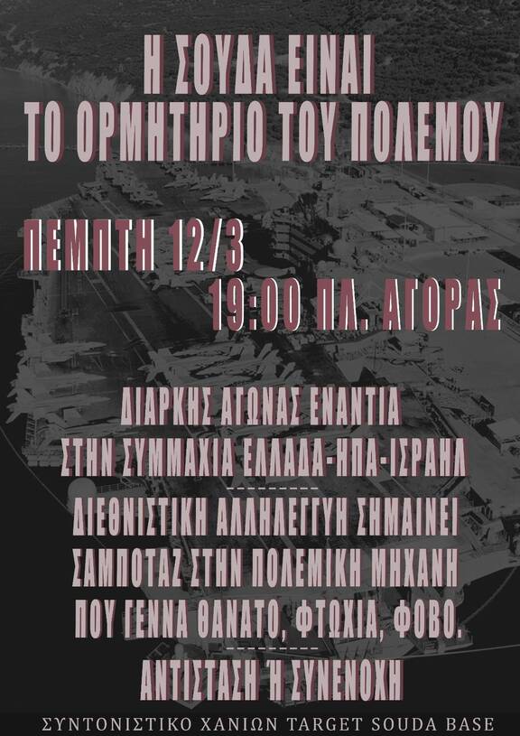 Η σούδα είναι το ορμητήριο του πολέμου. Διαρκής αγώνας ενάντια στην συμμαχία ελλάδα-η.π.α.-ισραήλ. Διεθνιστική αλληλεγγύη σημαίνει σαμποτάζ στην πολεμική μηχανή που γεννά θάνατο, φτώχια, φόβο. Αντίσταση ή συνενοχή. Κάλεσμα σε πορεία την Πέμπτη 12/3/2026 στης 19:00 στην πλατεία δημοτικής αγοράς στα Χανιά.