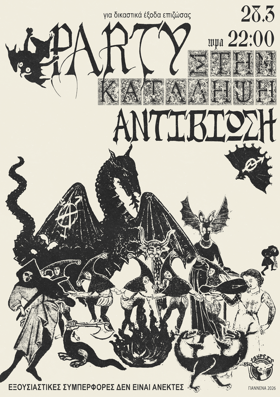 Πάρτυ για την κάλυψη δικαστικων εξόδων επιζωσας. Η δικαστική υπόθεση αφορά περιστατικό εμφυλης κακοποίησης που έλαβε χώρα στα Γιάννενα πριν από 5 χρόνια. Εκδικάζεται το φθινόπωρο και ο θύτης έχει καταθέσει και μυνηση για συκοφαντική δυσφήμιση κατά της επιζωσας. Το ποσό ανέρχεται στα 5.000 € και θα υπάρχει κουτί οικονομικής ενίσχυσης στον χώρο