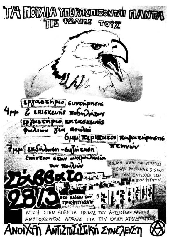 Θέλουμε κι εμείς σαν μία συνέλευση που ζει στους χώρους αγώνα, και συναντιέται σε καταλήψεις όπως ο Εξωστρεφής και τα Ζιζάνια να ενισχύσουμε με την παρουσία μας αυτόν τον αγώνα. Γι αυτό επιλέξαμε να διοργανώσουμε μια εκδήλωση στα προσφυγικά για τα πουλιά. Αυτά τα όμορφα όντα που ενώ συμβολίζουν την ελευθερία σε όλες τις κουλτούρες, ο πολιτισμός της εξουσίας προκλητικά φυλακίζει, βασανίζει και εξοντώνει. Θα μιλήσουμε για τη φροντίδα τους, την απελευθέρωση τους, την προστασία τους. Θα μιλήσουμε για το παράδειγμα ελευθερίας που μας δίνουν.