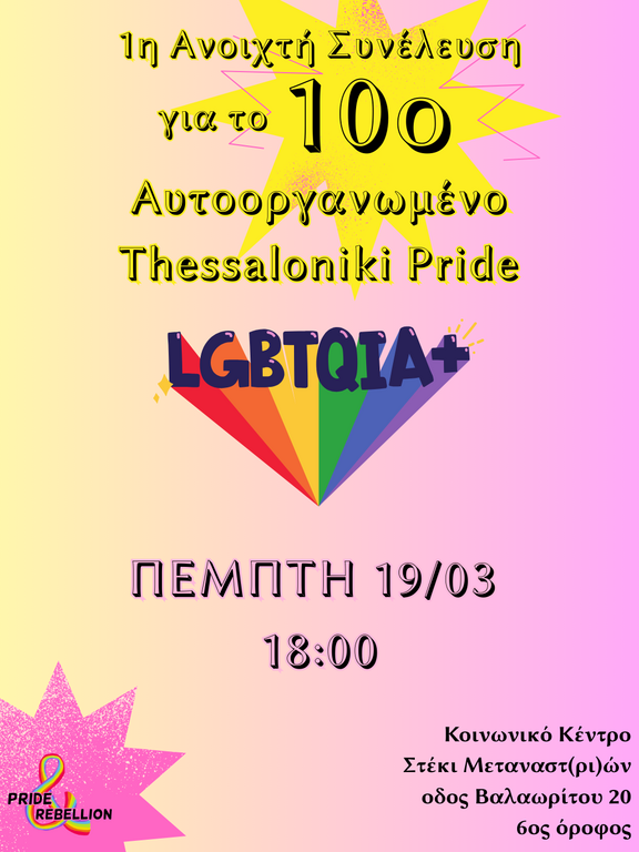 Σας καλούμε στην 1η ανοιχτή συνέλευση για το 10ο Αυτοοργανωμένο Thessaloniki Pride για να συνδιαμορφώσουμε τη διοργάνωσή του.