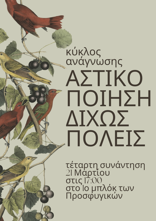 Ο κύκλος ανάγνωσης της Ευτοπίας θα συναντηθεί στο 1ο μπλοκ της γειτονιάς των Προσφυγικών αυτό το Σάββατο, 21 Μαρτίου, στις 17:00 για να συζητήσει το 5ο και το 6ο κεφάλαιο του βιβλίου Αστικοποίηση Δίχως Πόλεις. Η κουβέντα θα ξεκινήσει με μια γρήγορη σύνοψη των κεφαλαίων 1-6 για να είναι προσβάσιμη σε όλους.