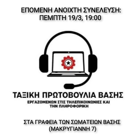📍Επόμενη ανοιχτή συνέλευση της Ταξικής Πρωτοβουλίας Βάσης Εργαζομένων στις Τηλεπικοινωνίες και την Πληροφορική: Πέμπτη 19/3 στις 7μ.μ., στα Γραφεία των Σωματείων Βάσης (Μακρυγιάννη 7)