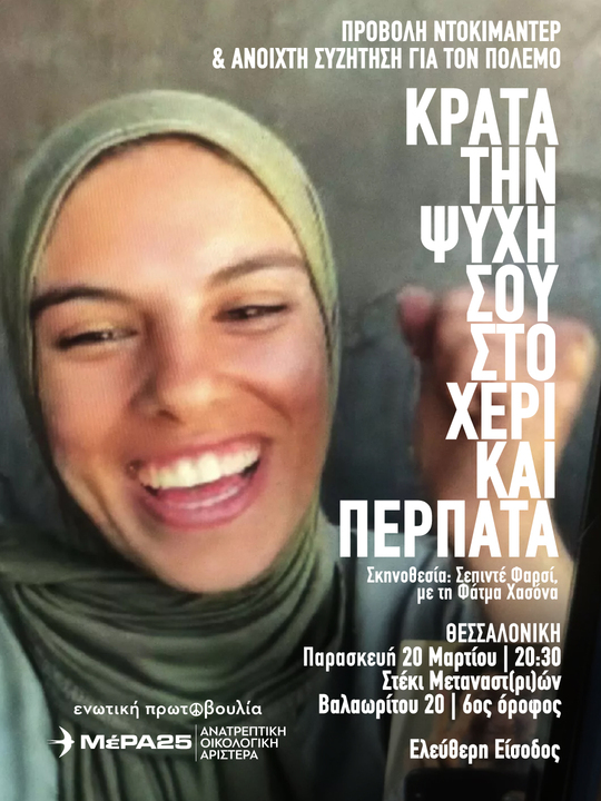Την Παρασκευή, 20 Μαρτίου, στις 20:30, στο Στέκι Μεταναστ(ρι)ών (Βαλαωρίτου 20, 6ος όροφος), η ενωτική πρωτοβουλία ΜέΡΑ25 | Ανατρεπτική Οικολογική Αριστερά Θεσσαλονίκης διοργανώνει προβολή του ντοκιμαντέρ «Κράτα την Ψυχή σου στο Χέρι και Περπάτα» (2025).