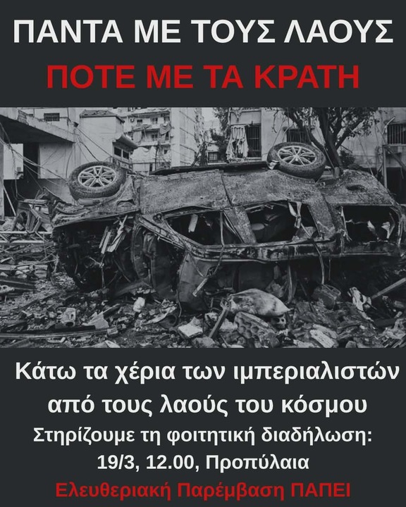Από τη στιγμή που η επίθεση που δεχόμαστε είναι συνολική και οργανωμένη, τέτοια θα πρέπει να είναι και η απάντηση μας, αν θέλει να ανταπεξέλθει στο μέγεθος των ευθυνών που μας αναλογούν στις καταστάσεις τις οποίες βρισκόμαστε. Στην προσπάθεια που γίνεται ώστε οι κοινωνιές να συνταχθούν πίσω από τους ηγέτες τους οι οποίοι τις οδηγούν προς τη σφαγή η θέση μας πρέπει να είναι ενάντια σε κάθε μορφής "εθνικού συμφέροντος", ενάντια σε κάθε προσπάθεια να μετατραπούν οι λαοί σε πιόνια σε μια γεωπολιτική σκακιέρα, προτάσσοντας τον διεθνισμό και την στο εδώ και το τώρα αδιαμεσολάβητη και ανειρήνευτη πάλη ενάντια στον πραγματικό εχθρό, ο οποίος βρίσκεται εντός των συνόρων, στις τράπεζες και στα υπουργεία. Από το δικό μας μετερίζι ως φοιτητές/τριές να μετατρέψουμε τις σχολές μας σε εστίες αγώνα ενάντια στους πολέμους μεταξύ των κυρίαρχων, και απέναντι σε κάθε προσπάθεια να χρησιμοποιηθούν οι ίδιες ή η έρευνα που παράγουν από την πολεμική βιομηχανία, έχοντας πάντα στο μυαλό μας πως η κοινωνική απελευθέρωση μπορεί να επιτευχθεί μονάχα από τις ίδιες τις κοινωνίες μέσα από τη συλλογική τους δράση, και πως από το Ιράν και τον Λίβανο που βάλλονται σήμερα μέχρι την Παλαιστίνη, το Σουδάν και την Ουκρανία η θέση μας είναι στο πλευρό των λαών -και μόνο.