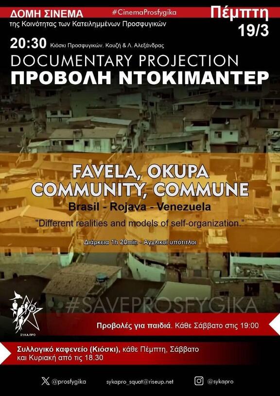Η Δομή Σινεμά επίσης οργανώνει προβολές για παιδιά κάθε Σάββατο στις 19.00 στο Στέκι των Κατειλημμένων Προσφυγικών (Κούζη & Τριχωνίδος).