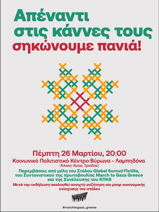 Σε μια περίοδο που η βία και η κατοχή εντείνονται στην Παλαιστίνη και ευρύτερα ο πόλεμος απλώνεται από την επιθετικότητα των ΗΠΑ Ισραήλ, συζητάμε, ενημερωνόμαστε και οργανωνόμαστε.