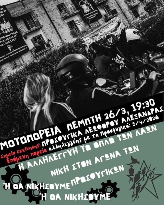 Η μοτοπορεία αυτή θα είναι μια από τις μαζικές κινήσεις που θα προπαγανδίζουν την επόμενη κεντρική πορεία υπεράσπισης και αλληλεγγύης με την Κοινότητα των Κατειλημμένων Προσφυγικών, στις 5/4, που θα συνοδεύεται από πανελλαδικό και διεθνές κάλεσμα για κινητοποιήσεις την ίδια μέρα.