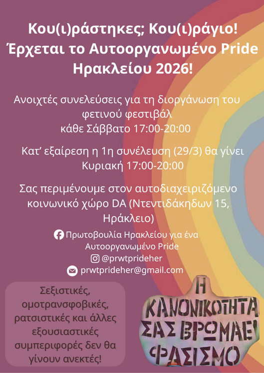 Κι όμως κάποια από μας παραείμαστε αλλόκοτα. Κάτι μέσα μας είναι πιο δυνατό από την ισχύ τους, όσο και να μας συμμόρφωσαν, πάλι δε χωράμε στα καλούπια τους. Κι επειδή από καιρό έχουμε βγει από τις ντουλάπες μας και επειδή ποτέ οι εξουσιαστές δε σου χαρίζουν τίποτα, συνεχίζουμε τον δρόμο που άνοιξαν τα δικά μας προγονικά πλάσματα, στο Stonewall και αλλού στη Γη, οργανώνοντας για μια ακόμη χρονιά το Pride Ηρακλείου. Ένα Pride που έγινε παγκρήτια το 2015 αυτοοργανωμένα από τα συντρόφια μας και ήταν το πρώτο μη θεσμικό και αυτοοργανωμένο σε όλη την επικράτεια.
