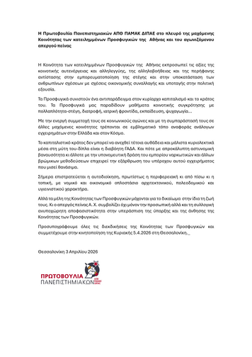 Πορεία αλληλεγγύης στην κοινότητα των κατειλημμένων προσφυγικών, Κυριακή 5/4/2026, 12:00, Άγαλμα Βενιζέλου