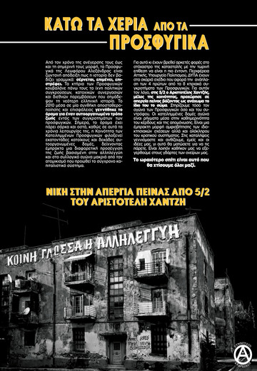 Για όλους τους λόγους του κόσμου λοιπόν ο Αριστοτέλης Χατζής μέλος της κοινότητας των κατειλημμένων Προσφυγικών, στις 5/2 βάζοντας ως ανάχωμα το ίδιο του το σώμα προχώρησε σε απεργία πείνας. Τα αιτήματα αυτού αλλά και της ίδιας της κοινότητας περιλαμβάνουν την άμεση ακύρωση της σύμβασης από την Περιφέρεια Αττικής, εγγυήσεις για την αποκατάσταση των προσφυγικών όχι από δημόσια κεφάλαια αλλά από τη μη κερδοσκοπική εταιρεία "Κάτοικοι και φιλοι Προσφυγικών Λ. Αλεξάνδρας Μη Κερδοσκοπική Εταιρία Αστικού Δικαίου" και ως εκ τούτου καμία απομάκρυνση των κατοίκων της κοινότητας από τα σπίτια τους. Έτσι και μεις απο την πλευρά μας για όλους τους λόγους του κόσμου στεκόμαστε αδιαπραγμάτευτα στο πλευρό της κοινότητας και των κατοίκων της. Είναι χρέος μας ως αναρχικοί/ες να σταθούμε στο πλευρό του συντρόφου που θέτοντας σε κίνδυνο τη ζωή του υπερασπίζεται τη συλλογική ζωή και ολόκληρη την κοινότητα αγώνα, αλλά και να ενώσουμε τις φωνές μας προπαγανδίζοντας τα αιτήματα της απεργίας και το δίκαιο του αγώνα των Προσφυγικών. Οι κατειλημμένες δομές αγώνα είναι ρήγματα μέσα στην καθημερινότητα του κέρδους και της απομόνωσης. Είναι μια έμπρακτη μορφή αμφισβήτησης των ιδιοκτησιακών σχέσεων αλλά και ολόκληρου του κρατικού συστήματος. Στις καταλήψεις γεννιόμαστε και ανθίζουμε, εμείς και οι ιδέες μας, γι αυτό θα ματώσετε για να τις πάρετε. Είναι λοιπόν καθήκον μας να εξεγερθούμε στους γδάρτες των ονείρων μας.