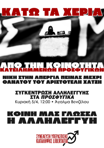 Ως ελάχιστη ένδειξη αλληλεγγύης στην κοινότητα των Προσφυγικών και τον Αριστοτέλη Χαντζή, ανακοινώνουμε πως θα ξεκινήσουμε συμβολική 24ωρη απεργία πείνας και δείψας, με έναρξη την Κυριακή 05/04/2026, ώρα 12:00 στο Άγαλμα Βενιζέλου.