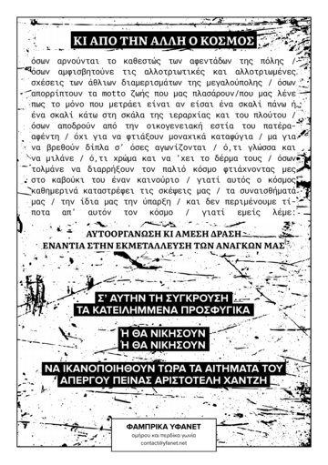 Είμαστε εδώ για να τους υπενθυμίσουμε ξανά πως οι αγώνες μας δεν έχουν τίποτα να φοβηθούν. Τα «τελεσίγραφα» καίγονται στους δρόμους και οι επιθέσεις των ένστολών καθαρμάτων που εισβάλλουν μέσα στο σκοτάδι της νύχτας στα Σπίτια του Αγώνα θα απαντώνται με ανακαταλήψεις, ανοικοδομήσεις και μαζικές συγκρούσεις, κάτω από το φως της μέρας. Το αναρχικό κίνημα γεννήθηκε μέσα από σχέσεις αμοιβαίας κοινωνικής αλληλοβοήθειας, αναπτύχθηκε και ενέπνευσε με το όπλο της αλληλεγγύης και αυτό παραμένει το ιδανικό και ο προσανατολισμός του για την κοινωνία που οραματίζεται, για τον κόσμο που θα χωρά μέσα του όλους τους κόσμους