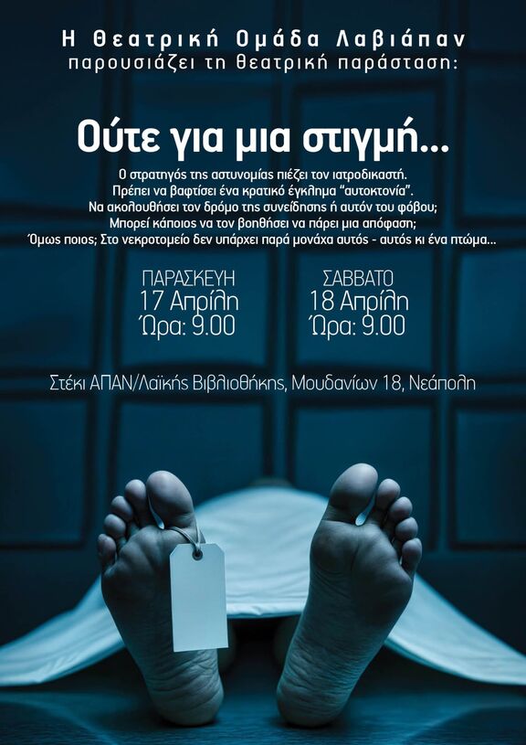 Η θεατρική ομάδα "Λαβιάπαν" του στεκιου μας κάνει πρεμιέρα Παρασκευή 17 και Σάββατο 18 Απρίλη στις 21.00 στο χώρο μας (Μουδανίων 18 Νεάπολη) με την παράσταση "Ούτε για μια στιγμή"
