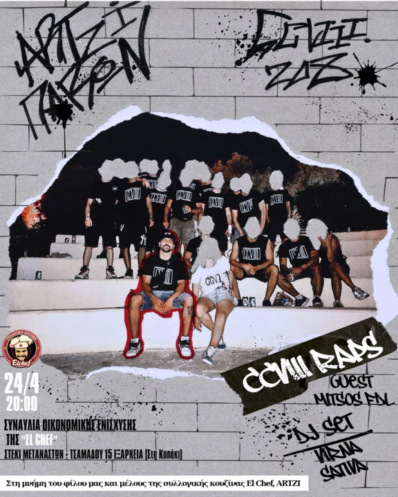 Στις 24/4 στις 20:00, στο Κηπάκι (Τσαμαδού 12, Εξάρχεια), η συλλογική κουζίνα El Chef διοργανώνει συναυλία οικονομικής ενίσχυσης. Μια βραδιά με ζωντανή μουσική από το CCVIII (208), με guest τον Mitsos FDL και DJ set από Virna και Sativa, αφιερωμένη στη μνήμη του φίλου και μέλους μας, Δημήτρη ARTZI. Σας περιμένουμε όλες και όλους για να στηρίξουμε, να θυμηθούμε και να βρεθούμε μαζί μέσα από τη μουσική και την αλληλεγγύη.