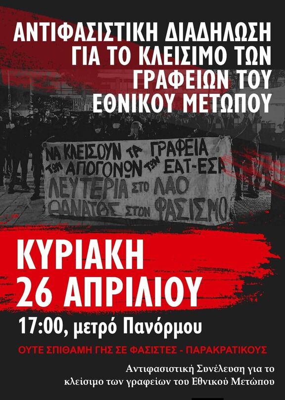 ΑΝΤΙΦΑΣΙΣΤΙΚΗ ΔΙΑΔΗΛΩΣΗ, ΚΥΡΙΑΚΗ 26/4, 17:00 Μέτρο Πανόρμου