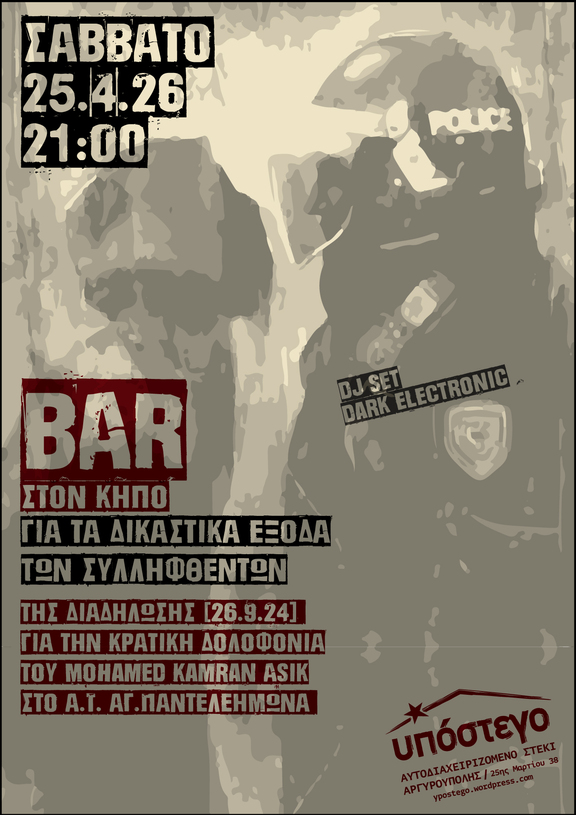 Μπαρ στον κήπο του Υποστέγου το Σάββατο 25/4 στις 21:00 για τα δικαστικά έξοδα των δύο συλληφθέντων της αντανακλαστικής διαδήλωσης που πραγματοποιήθηκε στις 26 Σεπτεμβρίου του 2024 για τον Πακιστανό εργάτη Mohamed Kamran Asik ο οποίος λίγες μέρες νωρίτερα (21.9) βρέθηκε νεκρός στο Α.Τ. Αγίου Παντελεήμονα μετά απο πολυήμερη κράτηση και άγρια βασανιστήρια από τους μπάτσους.