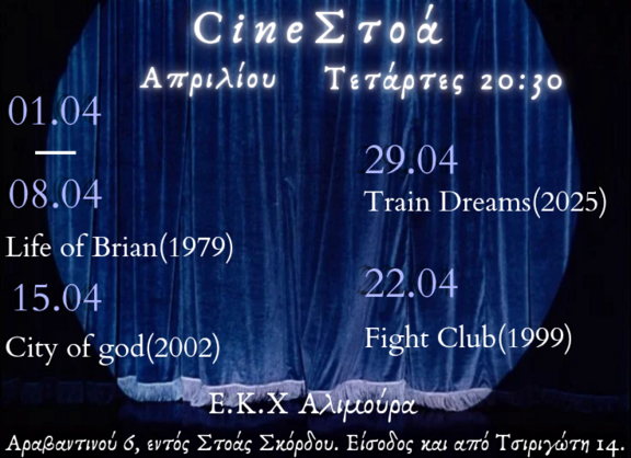 Η Αλιμούρα συνεχίζει με τα καθιερωμένα ανοίγματα κάθε Τετάρτη στις 20:30, σταθερά τους τελευταίους μήνες η ΣινέΣτοά προβάλλει ταινίες, άλλοτε με συγκεκριμένες θεματικές και άλλοτε απλά με ταινίες που μας μοιάζουν ενδιαφέρουσες και ας μην συνδέονται μεταξύ τους. Οι ταινίες δεν θα αργούνε να ξεκινήσουν, στο χώρο λειτουργεί επίσης και το βιβλιοπωλείο της αλιμούρας όπως και η δανειστική βιβλιοθήκη. Μετά από κάθε ταινία, όποτε υπάρχει διάθεση, αράζουμε στον χώρο, με ή χωρίς να πίνουμε, με ή χωρίς να συζητάμε, απλά για να χαλαρώσουμε. Σας περιμένουμε!🪻
