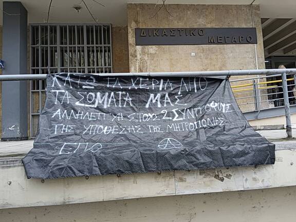 Τη στιγμή που οι κακοποιήσεις και οι δολοφονίες των γυναικών πληθαίνουν ανησυχητικά, ενώ παράλληλα χιλιάδες μετανάστες και μετανάστριες στοιβάζονται σε στρατόπεδα συγκέντρωσης, πνίγονται στο Αιγαίο και επαναπροωθούνται παράνομα και απάνθρωπα, το κράτος και οι κατασταλτικές του αρχές καθίζουν στο εδώλιο αγωνιστές και αγωνίστριες για συμβολικές παρεμβάσεις, για απλή συμμετοχή σε διαδηλώσεις, για απροκάλυπτες σκευωρίες, σε όλη την Ελλάδα. Πρόκειται βέβαια για τους μηχανισμούς ενός συστήματος που το ίδιο προάγει και επιβάλλει μεθοδικά τη διαίρεση, την αλλοτρίωση και τον κανιβαλισμό στις τάξεις των καταπιεσμένων, είτε με τη μορφή του ρατσισμού/εθνικισμού είτε με τη μορφή της πατριαρχίας, προκειμένου να αναπαράγεται και να διαιωνίζεται ακλόνητα. Αυτοί οι μηχανισμοί που συντηρούν και διευρύνουν συστηματικά την κοινωνική αδικία, την καταπίεση και την εκμετάλλευση, επιζητούν τώρα την τιμωρία των συντρόφων μας που αγωνίζονται έμπρακτα και ανιδιοτελώς ενάντια σε κάθε εξουσία για την ελευθερία, την ισότητα, την αλληλεγγύη και την κοινωνική δικαιοσύνη. Είμαστε αλληλέγγυοι σε κάθε έναν από αυτούς, όποιο μέσο αγώνα και αν επιλέγει, σε όποιο σημείο του κόσμου και αν βρίσκεται.