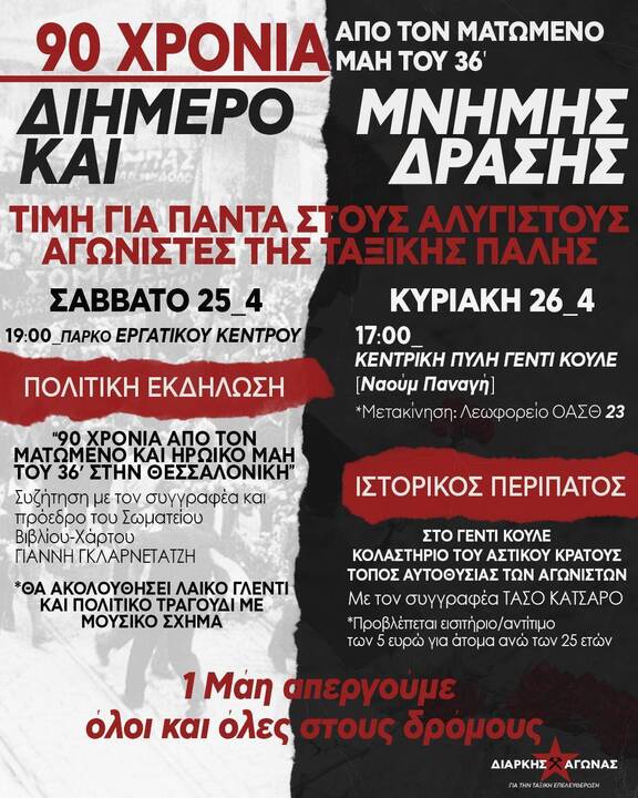 Το λαϊκό γλέντι με πολιτικό τραγούδι θα ξεκινήσει στις 21:00 με το πέρας την εκδήλωσης για τα 90 χρόνια από τον ματωμένο και ηρωικό Μάη του 36 στη Θεσσαλονίκη.