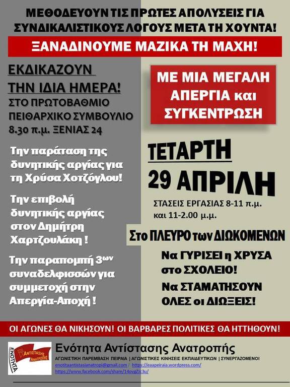 ΨΗΦΙΣΜΑ της ΑΝΟΙΧΤΗΣ ΣΥΝΕΛΕΥΣΗΣ Ενάντια στις Συνδικαλιστικές Διώξεις και Απολύσεις: Η Χρύσα Χοτζόγλου ξανά στο Πειθαρχικό Συμβούλιο - Όλοι στην απεργιακή συγκέντρωση στις 29/4, 8.30π.μ., Ξενίας 24