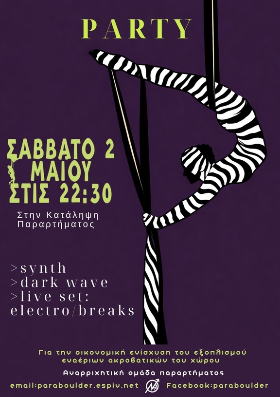 Σας περιμένουμε όλα το Σάββατο 02/05 στο πάρτι της αναρριχητικής ομάδας παραρτήματος με σκοπό την οικονομική ενίσχυση του εξοπλισμού των εναέριων ακροβατικών του χώρου .