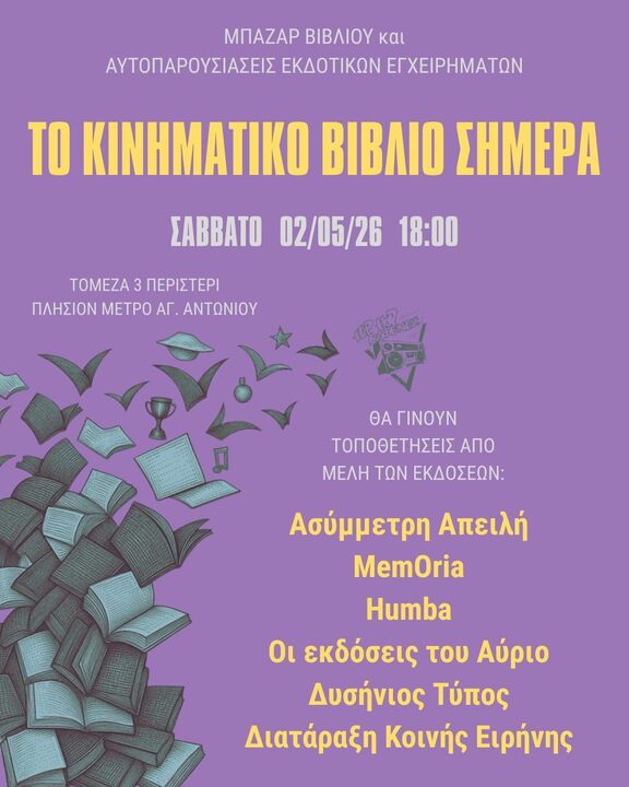 Το Σάββατο 2 Μαΐου 2026 έχουμε τη μεγάλη χαρά να φιλοξενούμε στον χώρο μας ένα Μπαζάρ Βιβλίου με Αυτοπαρουσιάσεις εκδοτικών εγχειρημάτων.