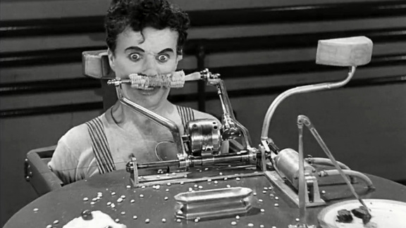 Ο Τσάπλιν, εργάτης σε ένα μεγάλο εργοστάσιο, δουλεύει με εξοντωτικούς ρυθμούς και προσπαθεί να συγχρονιστεί με τη γραμμή παραγωγής σφίγγοντας βίδες. Όταν θα συναντήσει μια καταζητούμενη ορφανή κοπέλα που ζει στο δρόμο, θα την ερωτευτεί και μαζί της θα αναζητήσει την ευτυχία μακριά από τον αστικό εφιάλτη της μοντέρνας βιομηχανικής κοινωνίας.