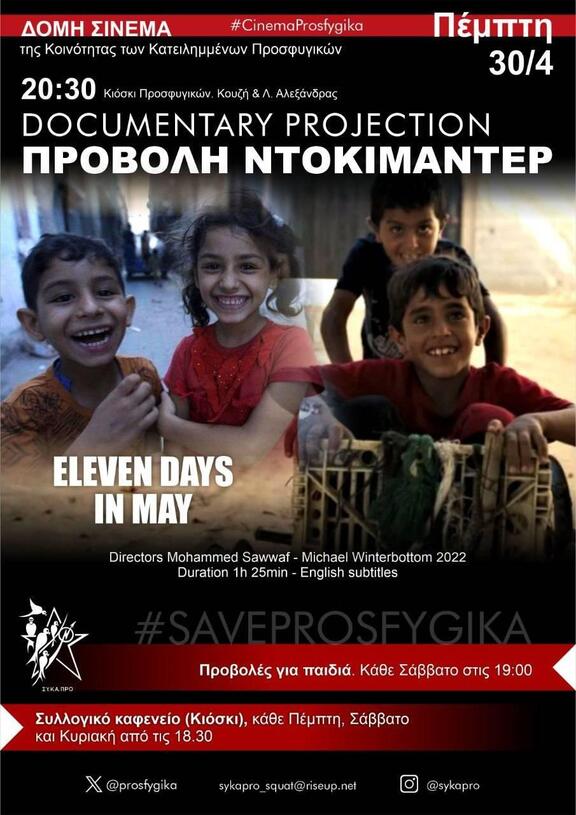Την Πέμπτη 30/4 στις 20:30 στο Κιόσκι των Προσφυγικών (Λ. Αλεξάνδρας & Κούζη) θα προβληθεί το ντοκιμαντέρ "Eleven Days in May", σκηνοθετημένο απο τους Mohammed Sawwaf και Michael Winterbottom το 2022. Η ταινία έχει διάρκεια 1 ώρα και 25 λεπτά και έχει αγγλικούς υπότιτλους.